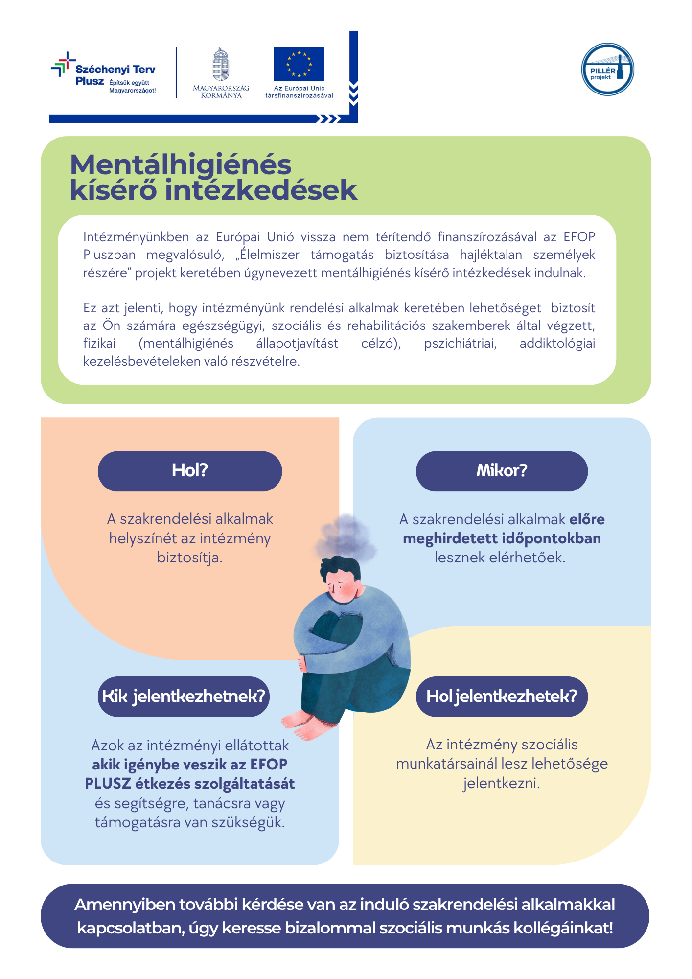 Az EFOP_PLUSZ-5.2.1-23-2024-00001” azonosítószámú, Élelmiszer támogatás biztosítása hajléktalan személyek részére” című pályázathoz kapcsolódó kísérő intézkedések II. szakaszának a Mentálhigiénés Kísérő Intézkedések (MKI) megvalósítása – I. Ütem címmel 2025.11.24-én nyílt pályázati felhívást tett közzé a Hajléktalanokért Közalapítvány.